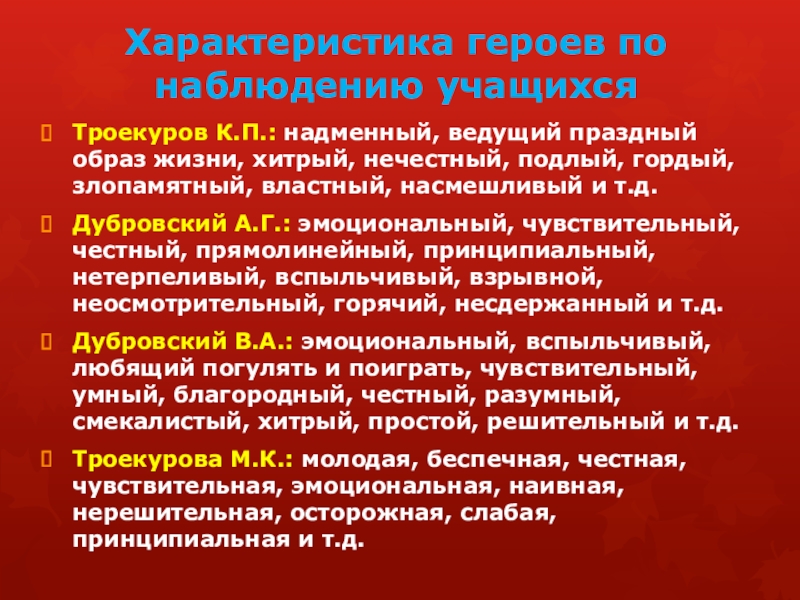 Дубровский В.А.: эмоциональный, вспыльчивый, любящий погулять и поиграть, чувствительный, умный, благородный, честный, разумный, смекалистый, хитрый, простой, решительный и т.д.