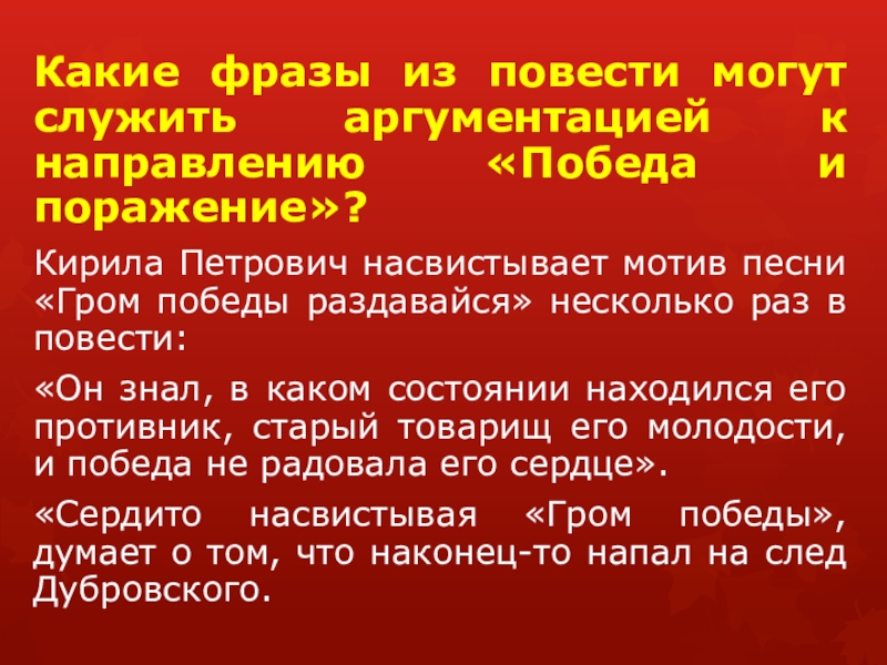 Кирила Петрович насвистывает мотив песни «Гром победы раздавайся» несколько раз в повести: