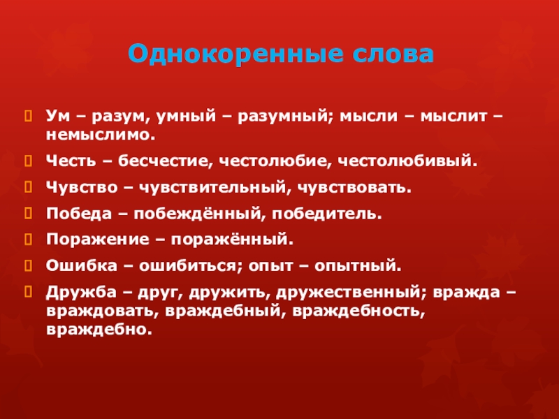Ум – разум, умный – разумный; мысли – мыслит –