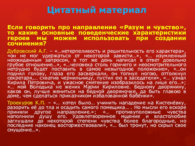 Дубровский А.Г. – «…нетерпеливость и решительность его характера», «он не мог удержаться от некоторой зависти…», «… изумленный неожиданным запросом, в тот же день написал в ответ довольно грубое отношение…», «…человека столь горячего и неосмотрительного нетрудно будет поставить в самое невыгодное положение», «…он поднял голову, глаза его засверкали, он топнул ногою, оттолкнул секретаря,… схватив чернильницу, пустил ею в заседателя», «… узнал Кирила Петровича, и ужасное смятение изобразилось на лице его…»; «… мой Володька не жених Марии Кириловне. Бедному дворянину, каков он, лучше жениться на бедной дворяночке, да быть главою в доме, чем сделаться приказчиком избалованной бабёнки».
