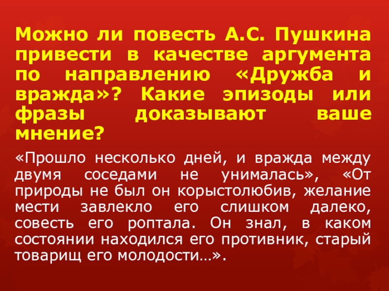 Можно ли сказать, что повесть А.С. Пушкина «Дубровский» о несостоявшейся дружбе и тяжёлых последствиях вражды? Докажите, почему?
