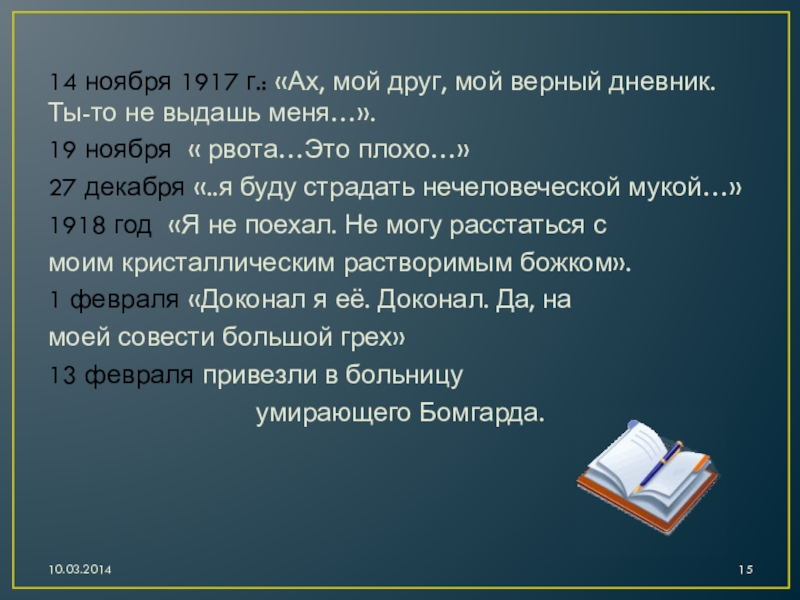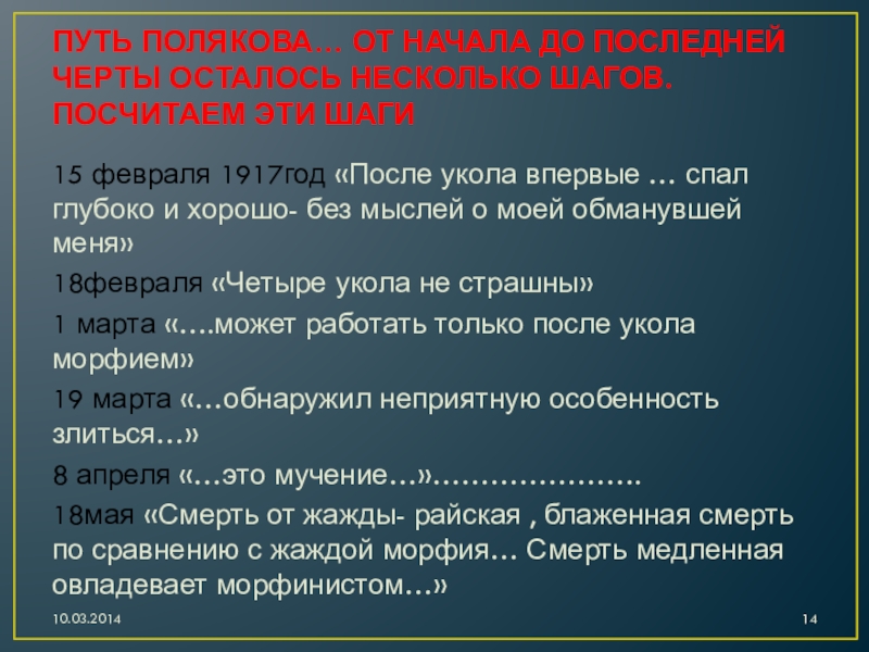 15 февраля 1917год «После укола впервые … спал глубоко и хорошо- без мыслей о моей обманувшей меня»