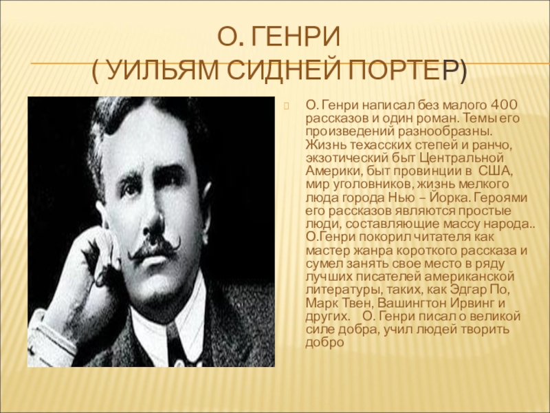 рассказов и один роман. Темы его произведений разнообразны. Жизнь техасских степей и ранчо, экзотический быт Центральной Америки, быт провинции в США, мир уголовников, жизнь мелкого люда города Нью – Йорка. Героями его рассказов являются простые люди, составляющие массу народа.. О.Генри покорил читателя как мастер жанра короткого рассказа и сумел занять свое место в ряду лучших писателей американской литературы, таких, как Эдгар По, Марк Твен, Вашингтон Ирвинг и других. О. Генри писал о великой силе добра, учил людей творить добро