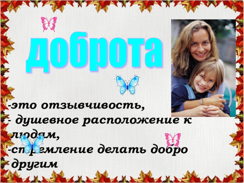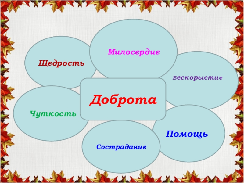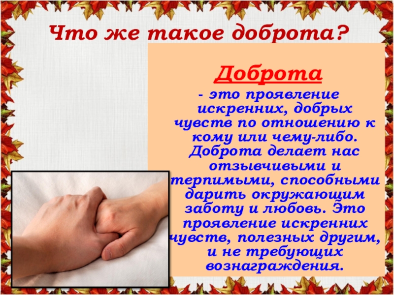 чувств по отношению к кому или чему-либо. Доброта делает нас отзывчивыми и терпимыми, способными дарить окружающим заботу и любовь. Это проявление искренних чувств, полезных другим, и не требующих вознаграждения.