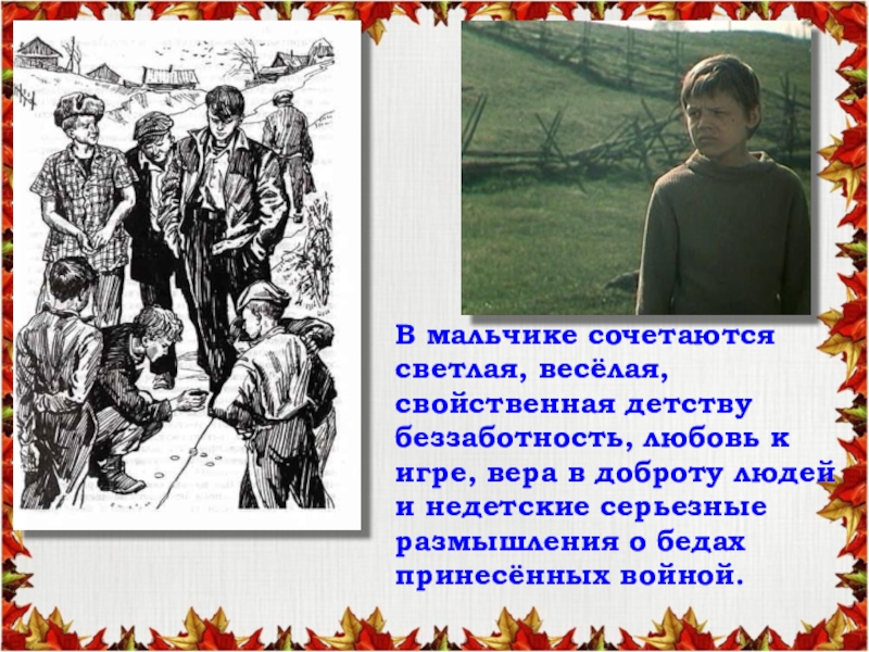 Слайд 21В мальчике сочетаются светлая, весёлая, свойственная детству беззаботность, любовь к игре,