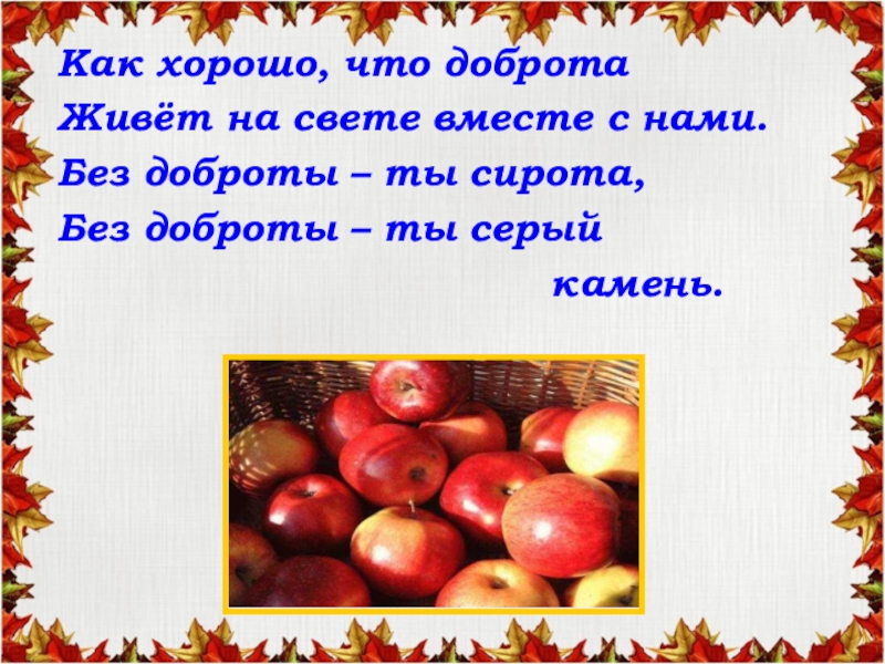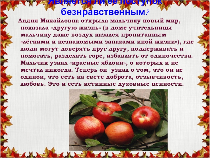 мир, показала «другую жизнь» (в доме учительницы мальчику даже воздух казался пропитанным «лёгкими и незнакомыми запахами иной жизни»), где люди могут доверять друг другу, поддерживать и помогать, разделять горе, избавлять от одиночества. Мальчик узнал «красные яблоки», о которых и не мечтал никогда. Теперь он узнал о том, что он не одинок, что есть на свете доброта, отзывчивость, любовь. Это и есть истинные духовные ценности.