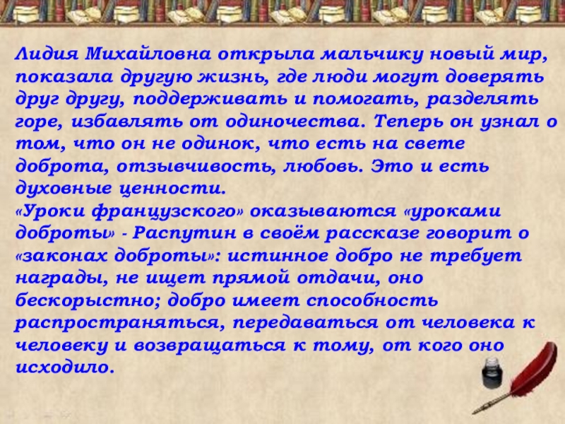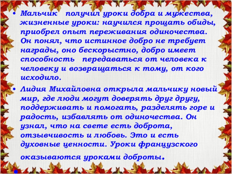 «Уроки французского» оказываются «уроками доброты» - Распутин в своём рассказе говорит о «законах доброты»: истинное добро не требует награды, не ищет прямой отдачи, оно бескорыстно; добро имеет способность распространяться, передаваться от человека к человеку и возвращаться к тому, от кого оно исходило.