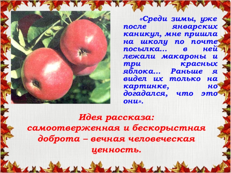 между людьми не нарушается, доброта не исчезает: «Среди зимы, уже после январских каникул, мне пришла в школу по почте посылка… в ней лежали макароны и три красных яблока… Раньше я видел их только на картине, но догадался, что это они».