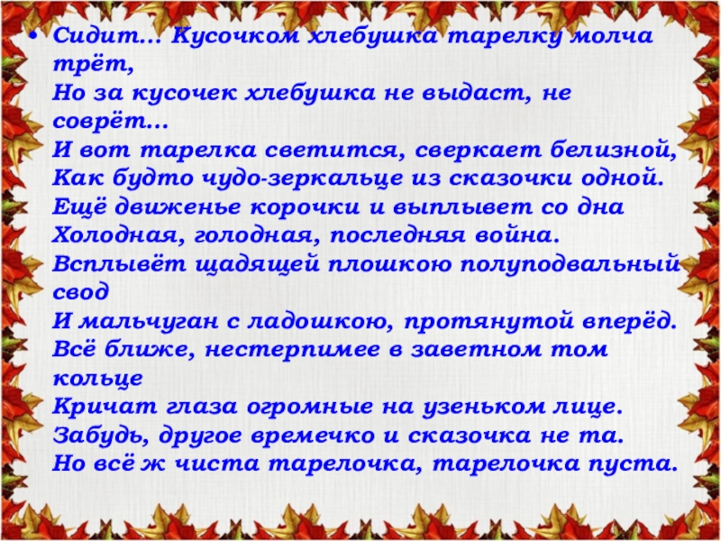 Слайд 14Сидит… Кусочком хлебушка тарелку молча трёт,