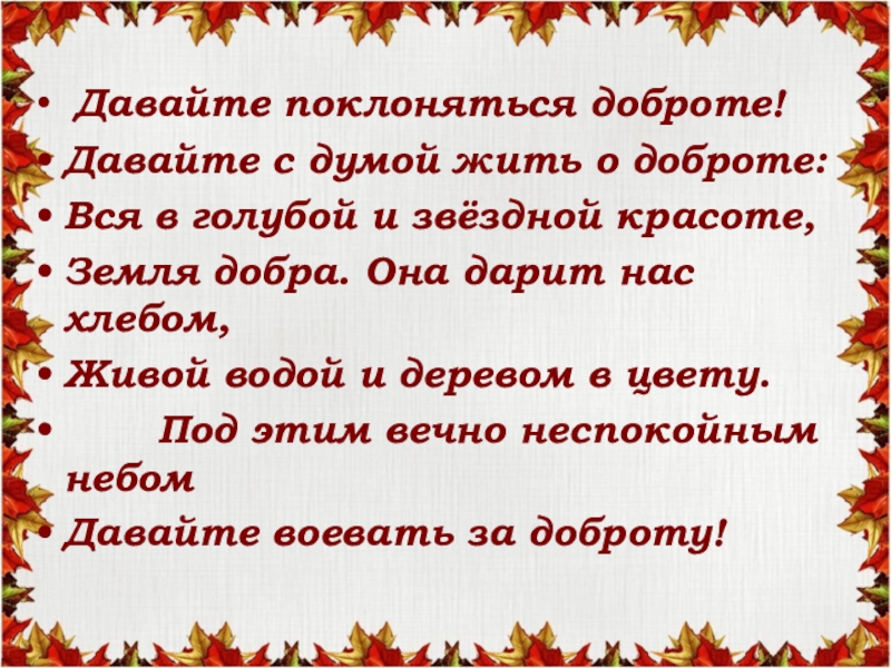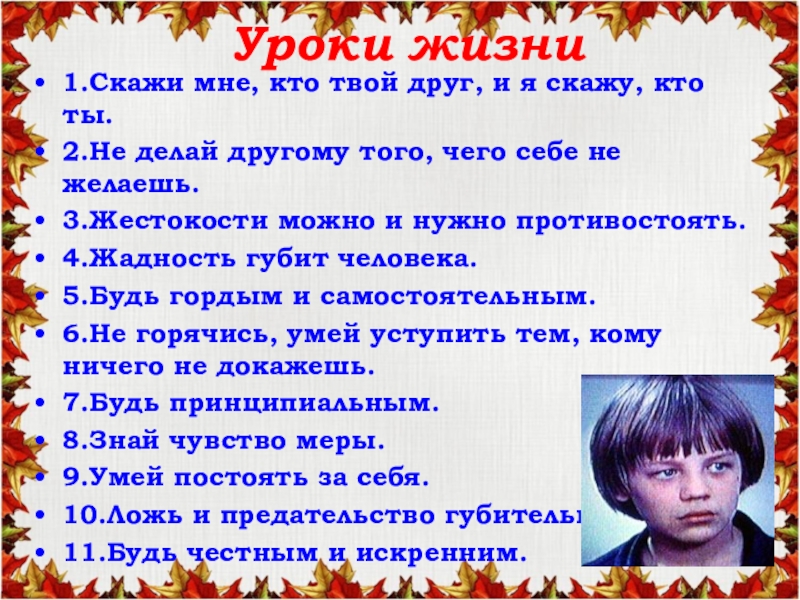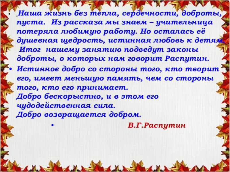 Итог нашему занятию подведут законы доброты, о которых нам говорит Распутин.