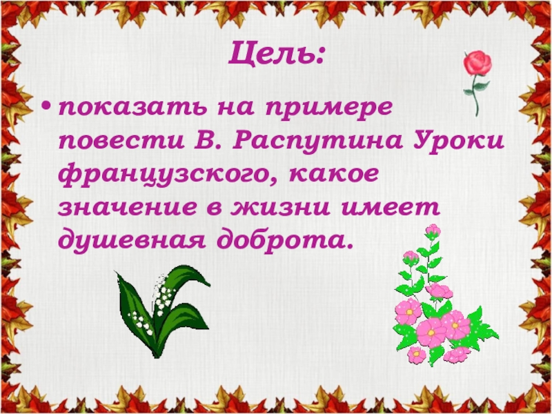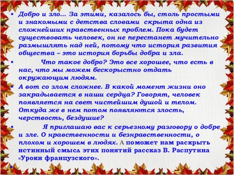 Я приглашаю вас к серьезному разговору о добре и зле. О нравственности и безнравственности, о плохом и хорошем в людях. А поможет нам раскрыть истинный смысл этих понятий рассказ В. Распутина «Уроки французского».