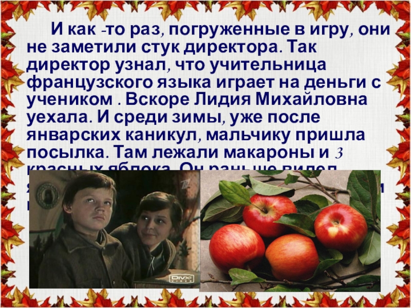 стук директора. Так директор узнал, что учительница французского языка играет на деньги с учеником . Вскоре Лидия Михайловна уехала. И среди зимы, уже после январских каникул, мальчику пришла посылка. Там лежали макароны и 3 красных яблока. Он раньше видел яблоки только на картинках.. А теперь и наяву.