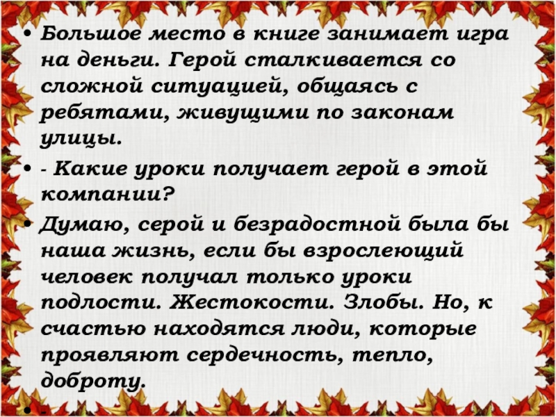 Слайд 51Большое место в книге занимает игра на деньги. Герой сталкивается со