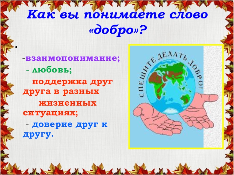 Что такое добро? Это все хорошее, что есть в нас, что мы можем бескорыстно отдать окружающим людям.