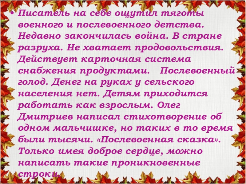 война. В стране разруха. Не хватает продовольствия. Действует карточная система снабжения продуктами. Послевоенный голод. Денег на руках у сельского населения нет. Детям приходится работать как взрослым. Олег Дмитриев написал стихотворение об одном мальчишке, но таких в то время были тысячи. «Послевоенная сказка». Только имея доброе сердце, можно написать такие проникновенные строки.