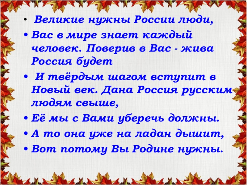 И твёрдым шагом вступит в Новый век. Дана Россия русским людям свыше,