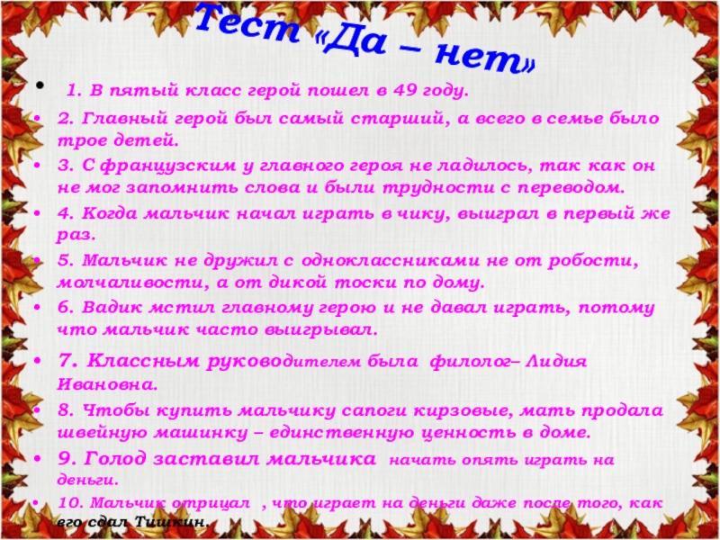 10. Мальчик отрицал , что играет на деньги даже после того, как его сдал Тишкин.