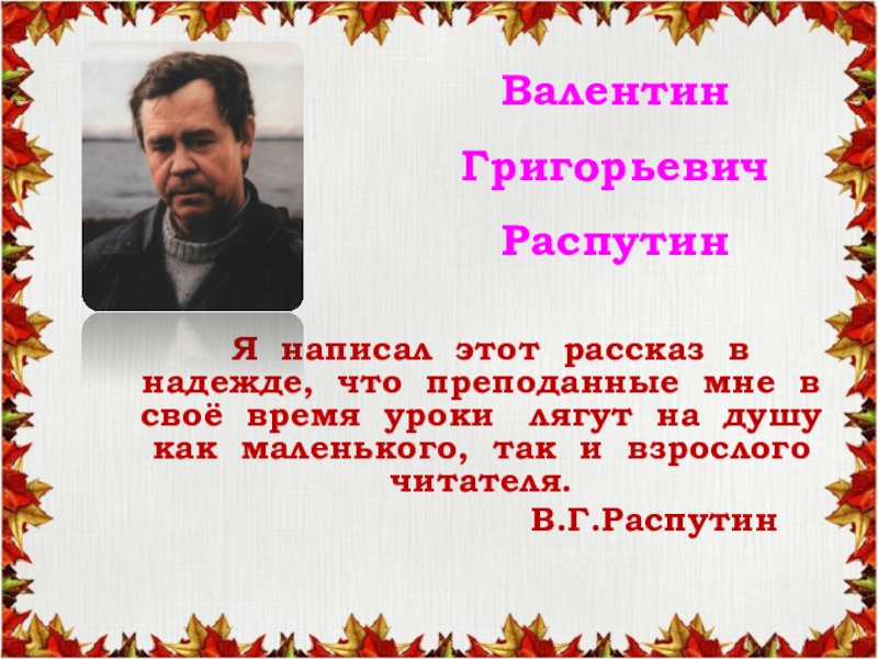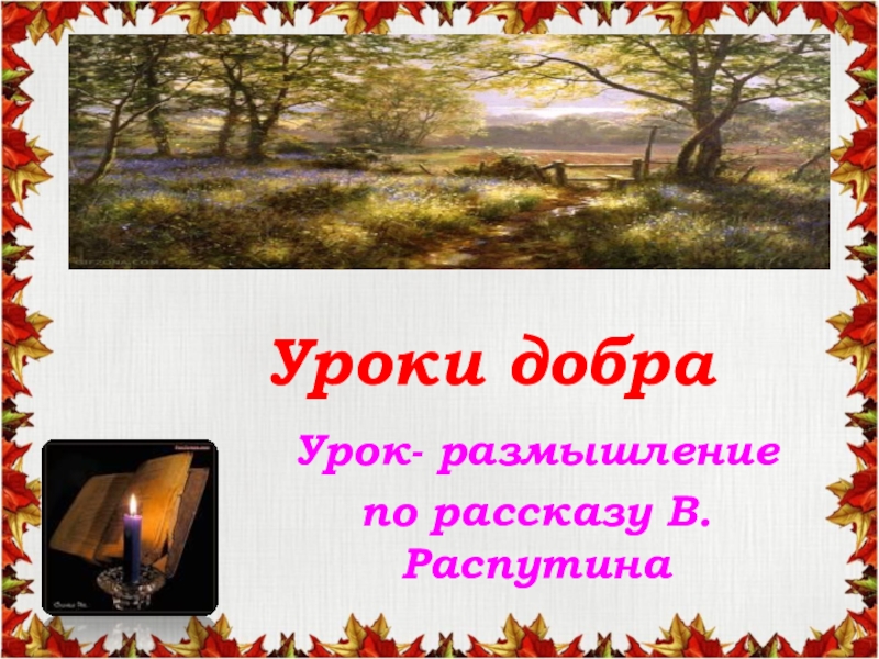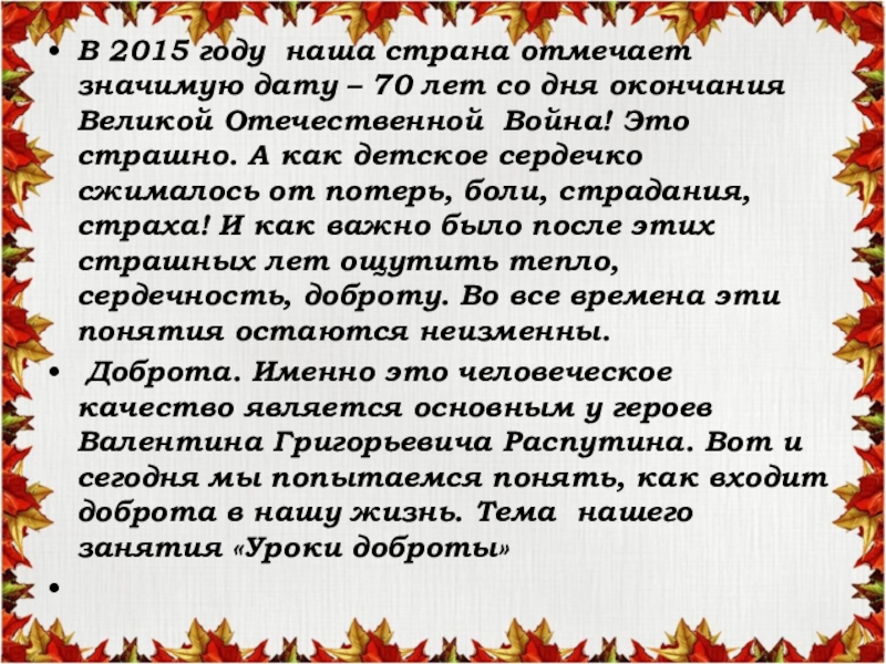 Доброта. Именно это человеческое качество является основным у героев Валентина Григорьевича Распутина. Вот и сегодня мы попытаемся понять, как входит доброта в нашу жизнь. Тема нашего занятия «Уроки доброты»