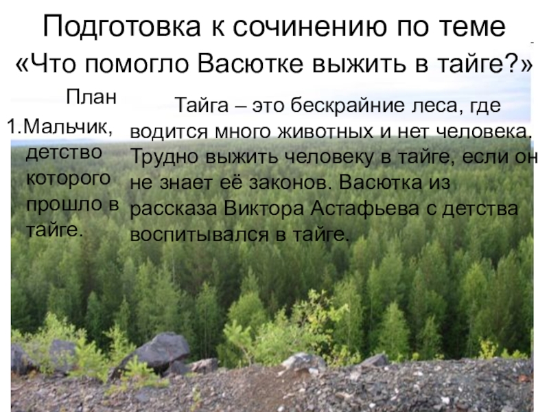 Тайга – это бескрайние леса, где водится много животных и нет человека. Трудно выжить человеку в тайге, если он не знает её законов. Васютка из рассказа Виктора Астафьева с детства воспитывался в тайге.