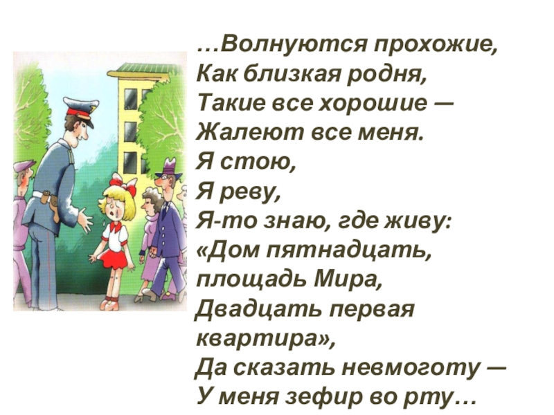 …Волнуются прохожие,Как близкая родня,Такие все хорошие —Жалеют все меня.Я стою,Я реву,Я-то знаю, где живу:«Дом пятнадцать, площадь Мира,Двадцать