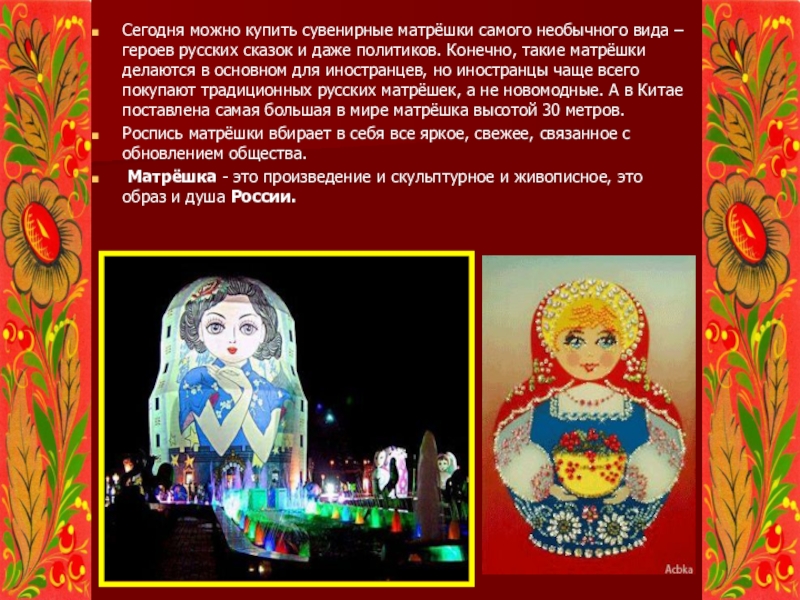 сказок и даже политиков. Конечно, такие матрёшки делаются в основном для иностранцев, но иностранцы чаще всего покупают традиционных русских матрёшек, а не новомодные. А в Китае поставлена самая большая в мире матрёшка высотой 30 метров.