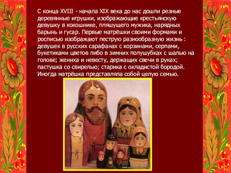 деревянные игрушки, изображающие крестьянскую девушку в кокошнике, пляшущего мужика, нарядных барынь и гусар. Первые матрёшки своими формами и росписью изображают пеструю разнообразную жизнь : девушек в русских сарафанах с корзинами, серпами, букетиками цветов либо в зимних полушубках с шалью на голове; жениха и невесту, держащих свечи в руках; пастушка со свирелью; старика с окладистой бородой. Иногда матрёшка представляла собой целую семью.