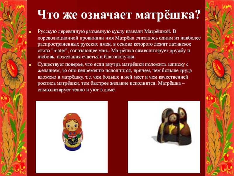 провинции имя Матрёна считалось одним из наиболее распространенных русских имен, в основе которого лежит латинское слово "mater", означающее мать. Матрёшка символизирует дружбу и любовь, пожелания счастья и благополучия.