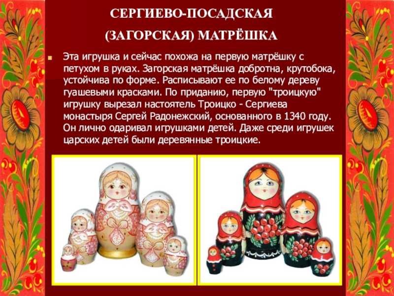 с петухом в руках. Загорская матрёшка добротна, крутобока, устойчива по форме. Расписывают ее по белому дереву гуашевыми красками. По приданию, первую "троицкую" игрушку вырезал настоятель Троицко - Сергиева монастыря Сергей Радонежский, основанного в 1340 году. Он лично одаривал игрушками детей. Даже среди игрушек царских детей были деревянные троицкие.