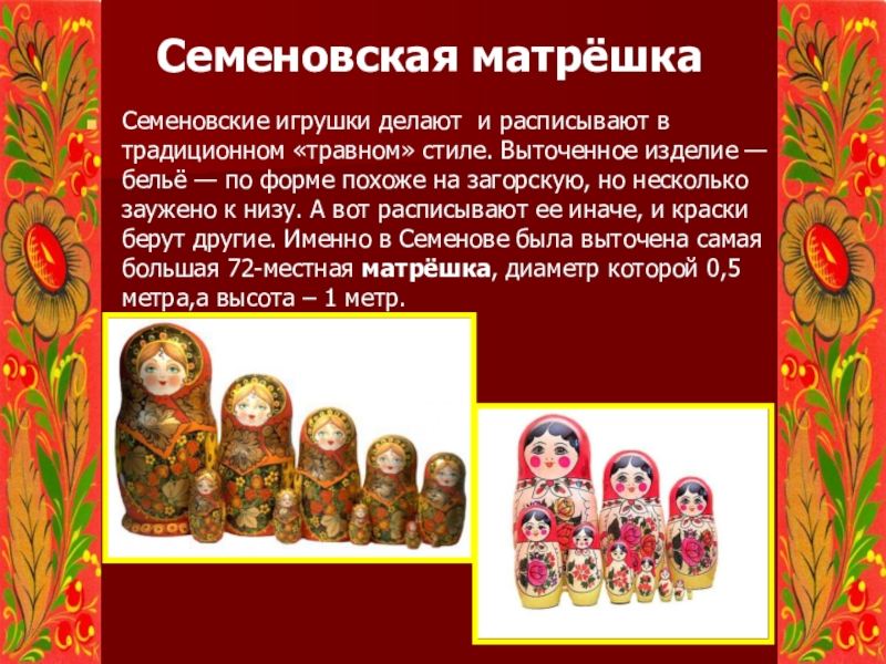 изделие — бельё — по форме похоже на загорскую, но несколько заужено к низу. А вот расписывают ее иначе, и краски берут другие. Именно в Семенове была выточена самая большая 72-местная матрёшка, диаметр которой 0,5 метра,а высота – 1 метр.