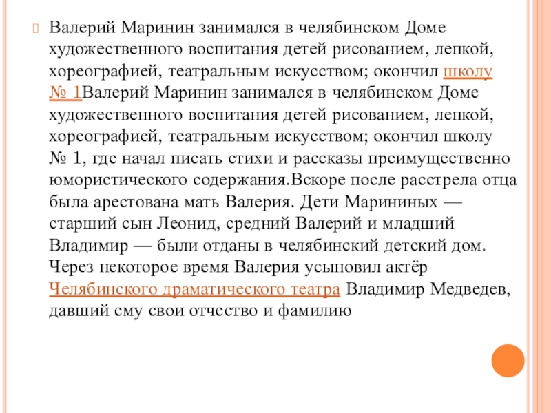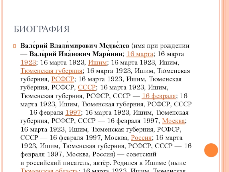 марта; 16 марта 1923; 16 марта 1923, Ишим; 16 марта 1923, Ишим, Тюменская губерния; 16 марта 1923, Ишим, Тюменская губерния, РСФСР; 16 марта 1923, Ишим, Тюменская губерния, РСФСР, СССР; 16 марта 1923, Ишим, Тюменская губерния, РСФСР, СССР — 16 февраля; 16 марта 1923, Ишим, Тюменская губерния, РСФСР, СССР — 16 февраля 1997; 16 марта 1923, Ишим, Тюменская губерния, РСФСР, СССР — 16 февраля 1997, Москва; 16 марта 1923, Ишим, Тюменская губерния, РСФСР, СССР — 16 февраля 1997, Москва, Россия; 16 марта 1923, Ишим, Тюменская губерния, РСФСР, СССР — 16 февраля 1997, Москва, Россия) — советский и российский писатель, актёр. Родился в Ишиме (ныне Тюменская область; 16 марта 1923, Ишим, Тюменская губерния, РСФСР, СССР — 16 февраля 1997, Москва, Россия) — советский и российский писатель, актёр. Родился в Ишиме (ныне Тюменская область) в семье комиссара РККА; 16 марта 1923, Ишим, Тюменская губерния, РСФСР, СССР — 16 февраля 1997, Москва, Россия) — советский и российский писатель, актёр. Родился в Ишиме (ныне Тюменская область) в семье комиссара РККА Ивана Павловича Маринина и медсестры Эмилии Ивановны Шевченко. В 1935 году семья переехала в Челябинск, где отец будущего писателя получил должность начальника областного управления коневодства. И. П. Маринин был арестован и расстрелян по обвинению в контрреволюционной деятельности