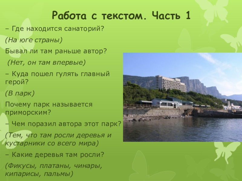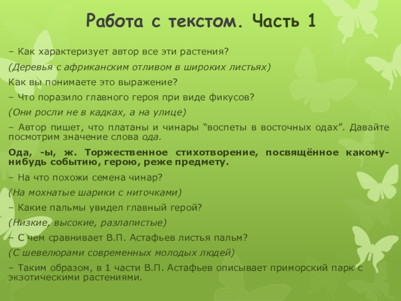 – Таким образом, в 1 части В.П. Астафьев описывает приморский парк с экзотическими растениями.