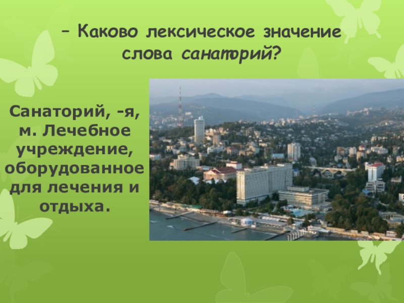 Санаторий, -я, м. Лечебное учреждение, оборудованное для