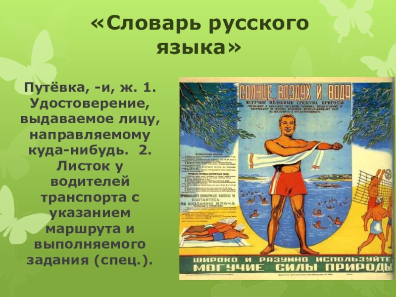 Путёвка, -и, ж. 1. Удостоверение, выдаваемое лицу, направляемому куда-нибудь.