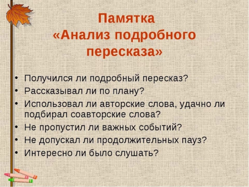 Получилось два варианта плана: в первом даны опорные фразы, на которые мы будем нанизывать слова и предложения, а во втором отражена последовательность событий.