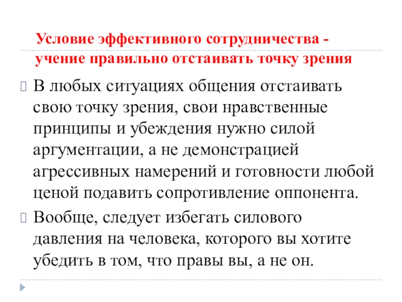 Слайд 14Условие эффективного сотрудничества - учение правильно отстаивать точку зрения