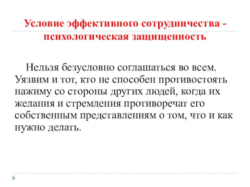 Слайд 16Условие эффективного сотрудничества - психологическая защищенность