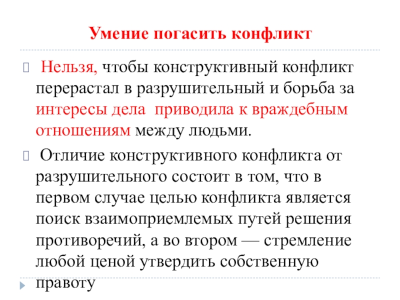 Отличие конструктивного конфликта от разрушительного состоит в том, что в первом случае целью конфликта является поиск взаимоприемлемых путей решения противоречий, а во втором — стремление любой ценой утвердить собственную правоту