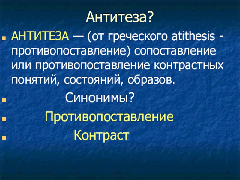 Антитеза?АНТИТЕЗА — (от греческого atithesis - противопоставление) сопоставление или противопоставление контрастных понятий, состояний, образов.