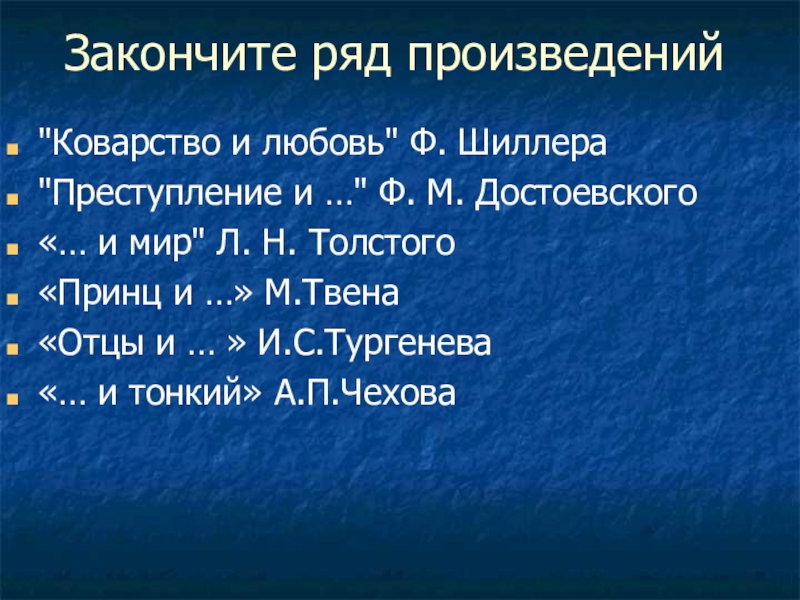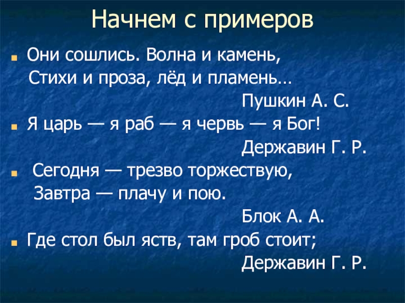 Начнем с примеровОни сошлись. Волна и камень, Стихи и проза, лёд и пламень… Пушкин А.