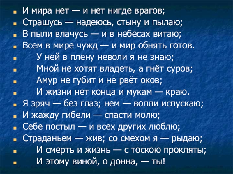 И мира нет — и нет нигде врагов;Страшусь — надеюсь, стыну и пылаю;В пыли влачусь — и
