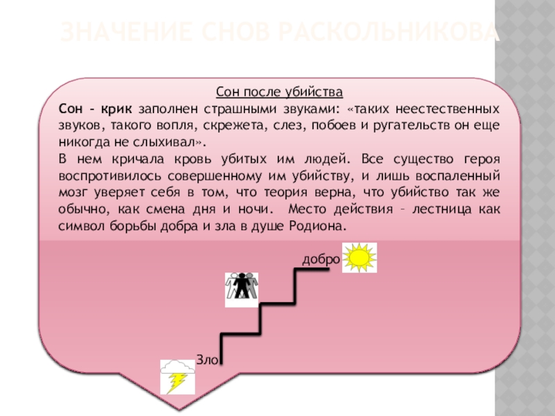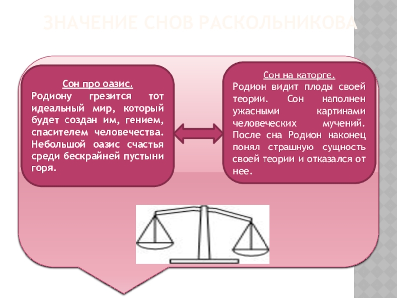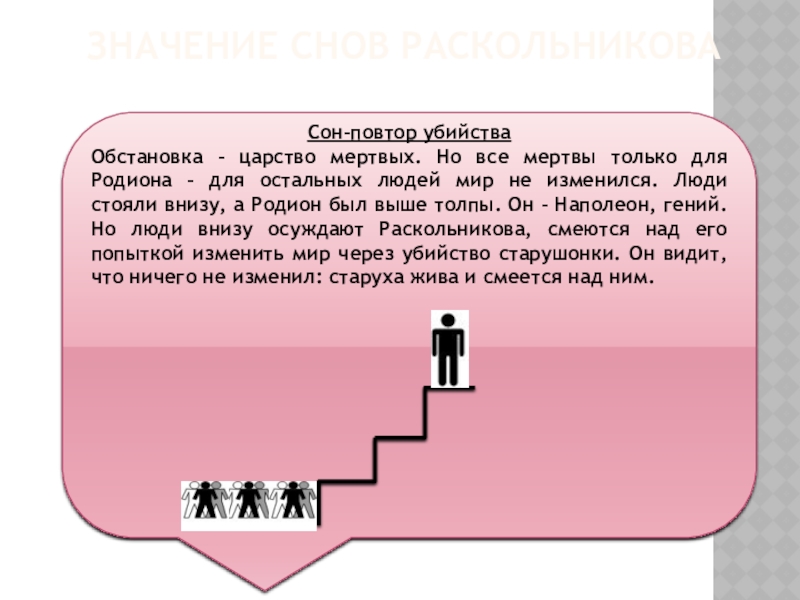 Родион видит плоды своей теории. Сон наполнен ужасными картинами человеческих мучений. После сна Родион наконец понял страшную сущность своей теории и отказался от нее.