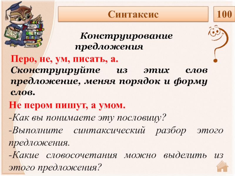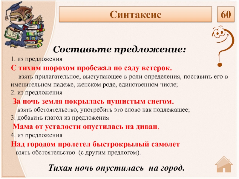 Сконструируйте из этих слов предложение, меняя порядок и форму слов.
