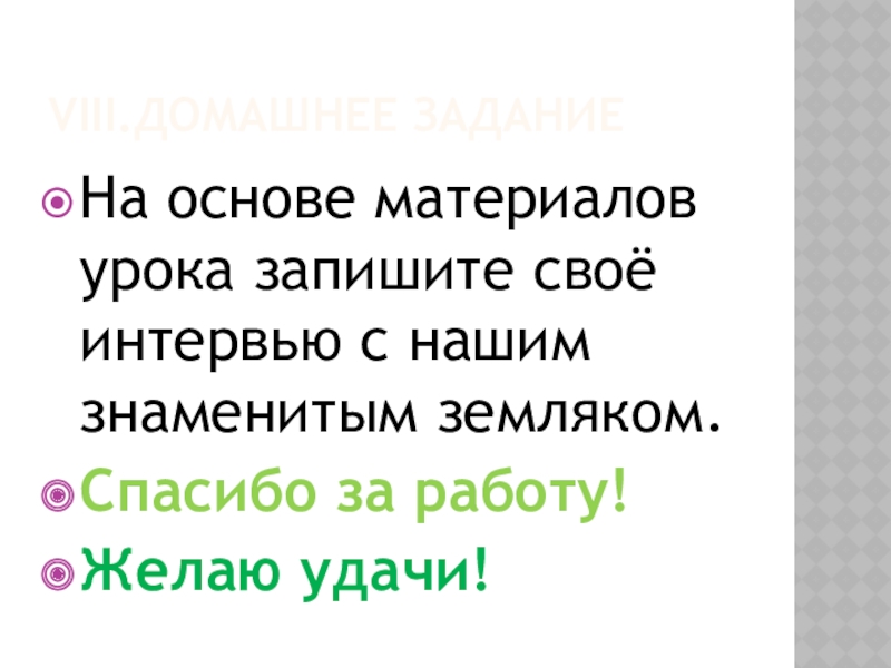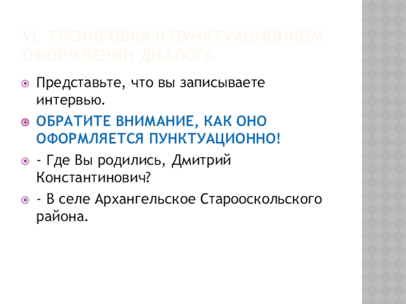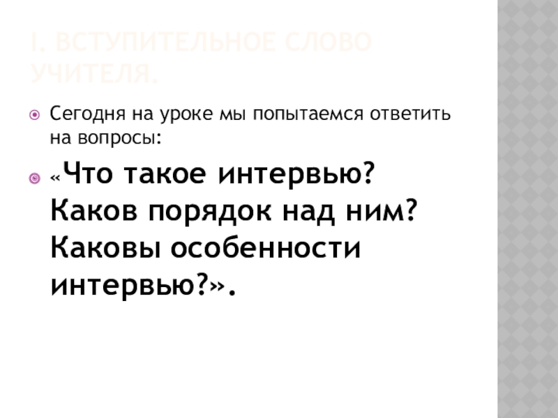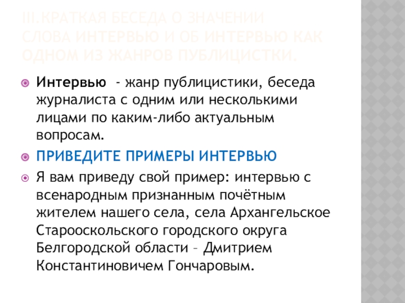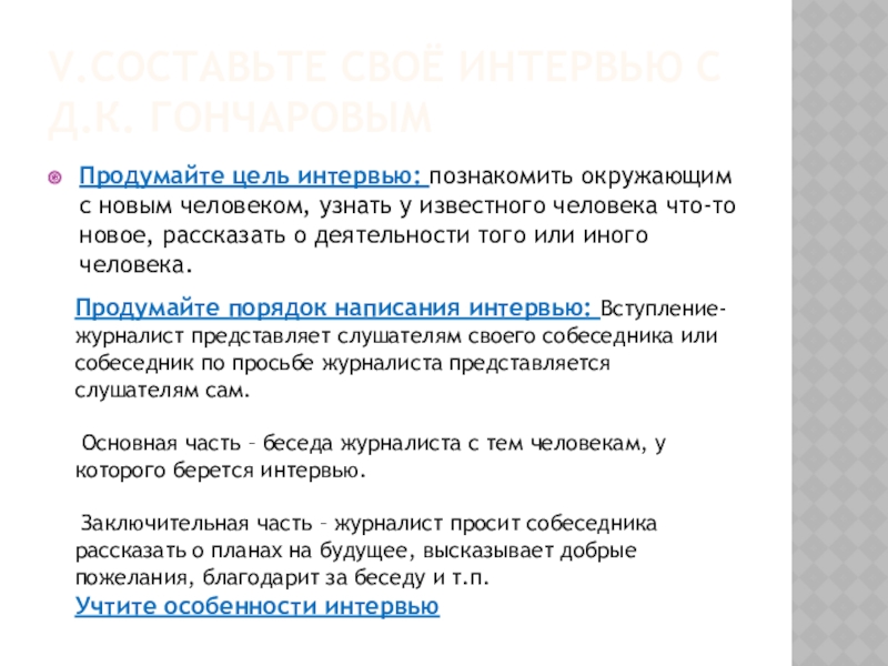 Продумайте порядок написания интервью: Вступление- журналист представляет слушателям своего собеседника или собеседник по просьбе журналиста представляется слушателям сам.