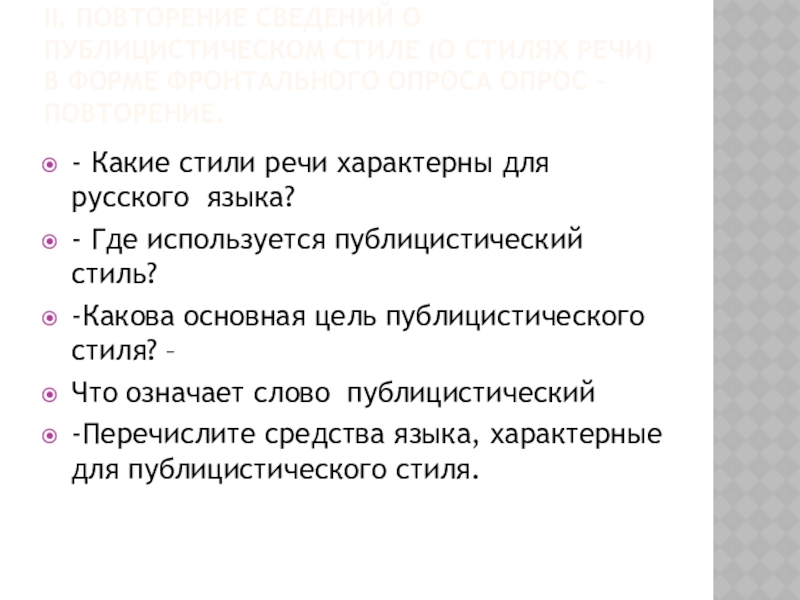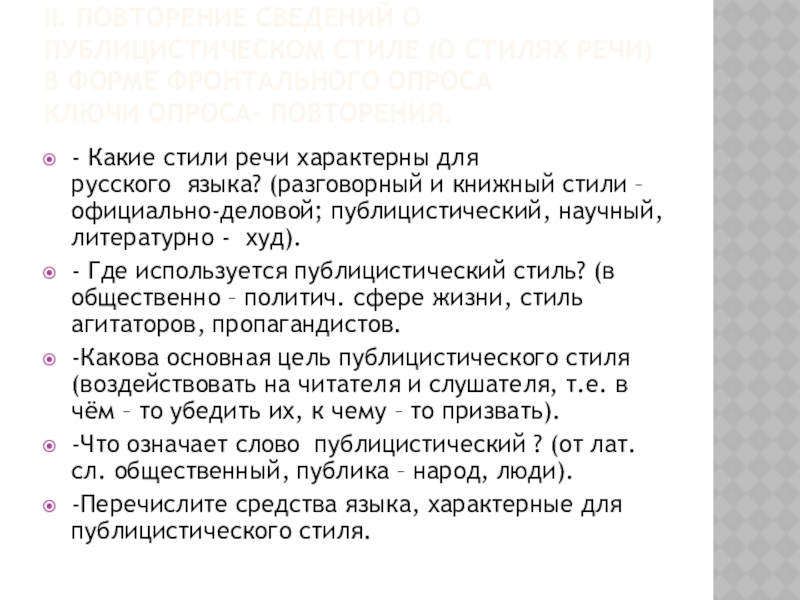 - Где используется публицистический стиль? (в общественно – политич. сфере жизни, стиль агитаторов, пропагандистов.