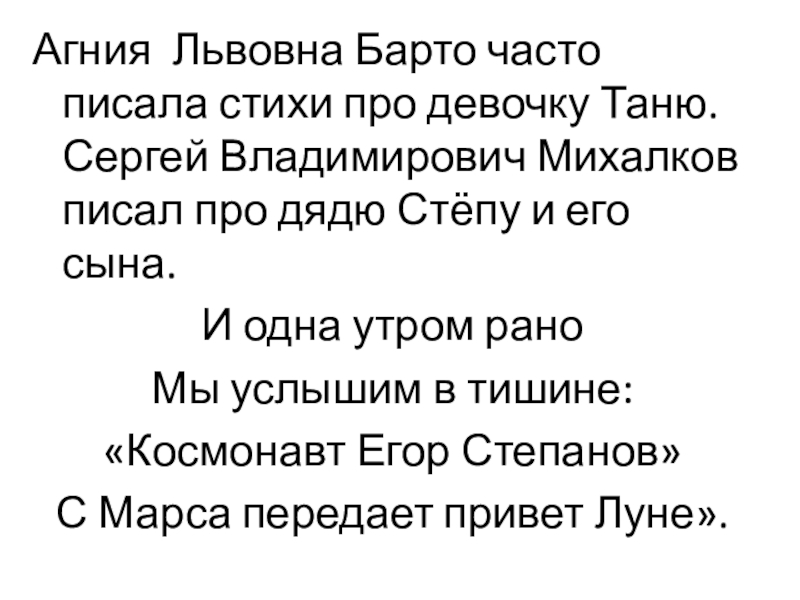 Агния Львовна Барто часто писала стихи про девочку Таню. Сергей Владимирович Михалков писал про дядю Стёпу и