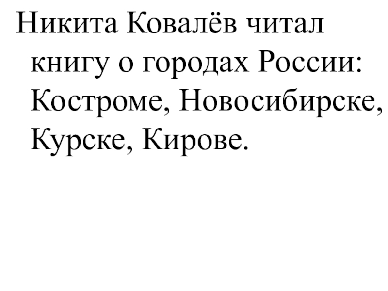 Слайд 2Никита Ковалёв читал книгу о городах России: Костроме, Новосибирске, Курске, Кирове.