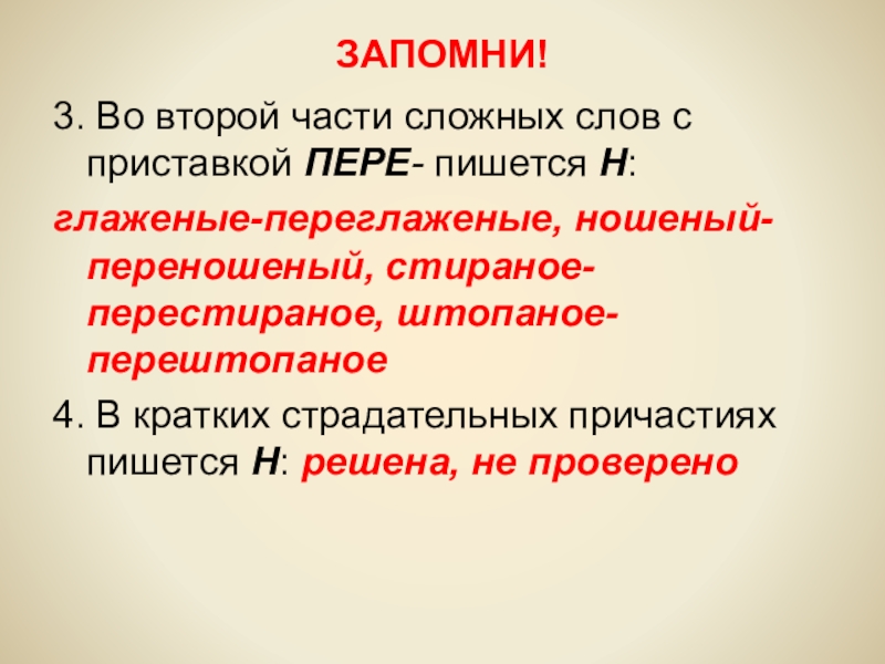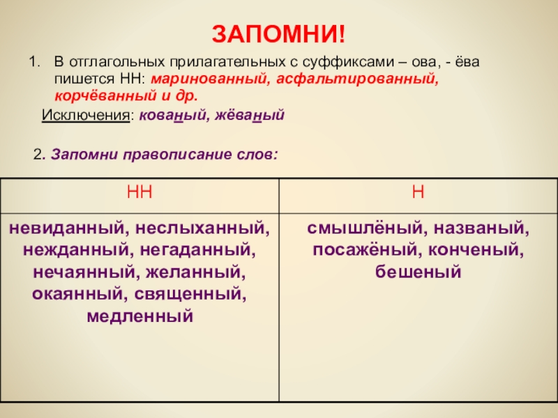 воспитанник (воспитанный), избранник (избранный), вареник (варёный), копчёности (копчёный), мороженое (мороженый), бешено (бешеный), ветрено (ветреный), путано (путаный)