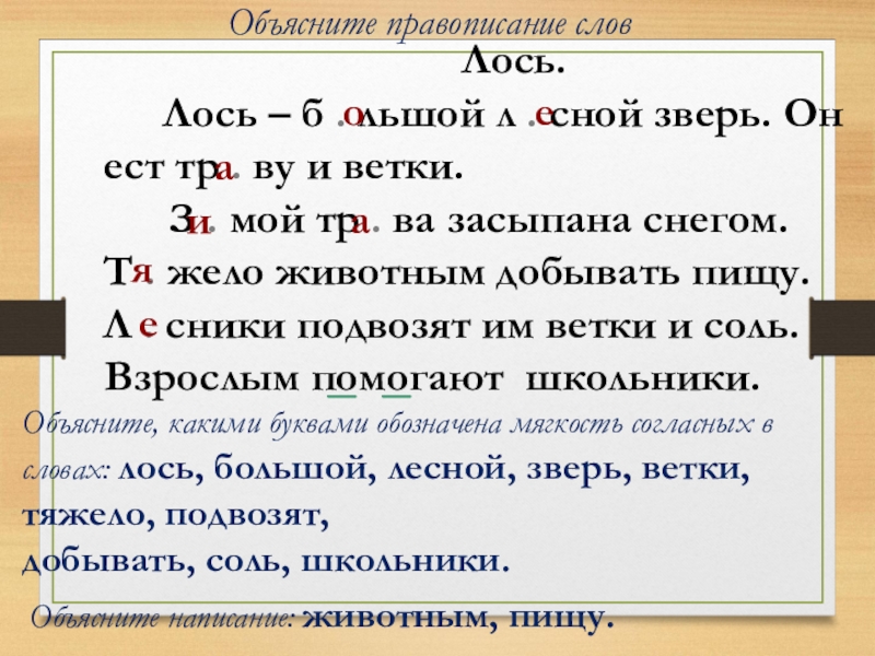 Объясните, какими буквами обозначена мягкость согласных в словах: лось, большой, лесной, зверь, ветки, тяжело, подвозят,