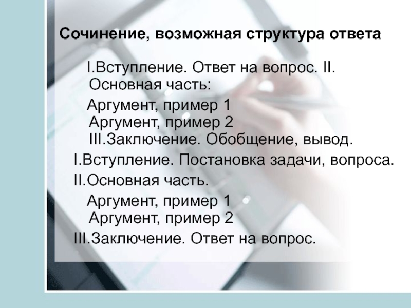 Аргумент, пример 1 Аргумент, пример 2 III.Заключение. Обобщение, вывод.