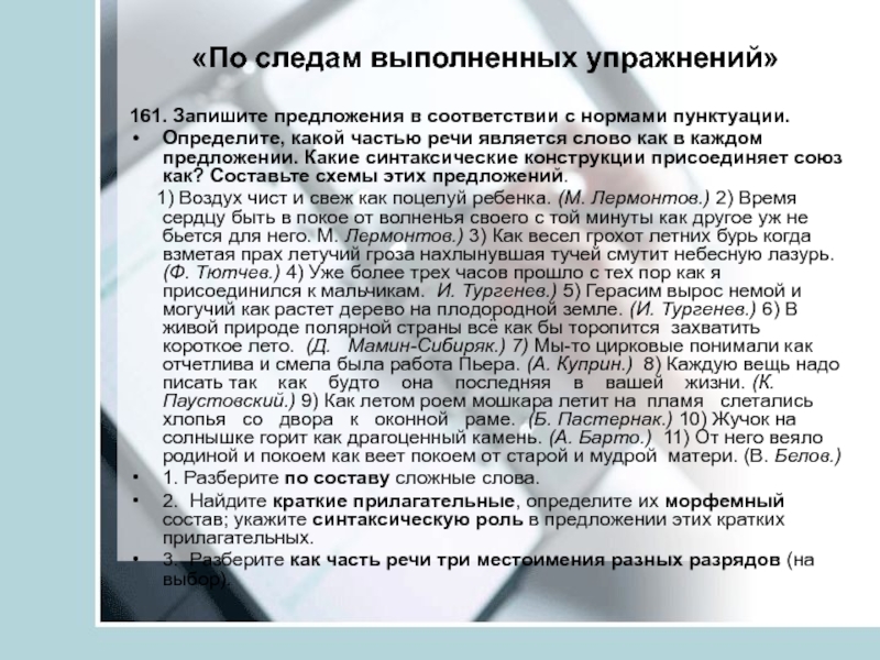 1) Воздух чист и свеж как поцелуй ребенка. (М. Лермонтов.) 2) Время сердцу быть в покое от волненья своего с той минуты как другое уж не бьется для него. М. Лермонтов.) 3) Как весел грохот летних бурь когда взметая прах летучий гроза нахлынувшая тучей смутит небесную лазурь. (Ф. Тютчев.) 4) Уже более трех часов прошло с тех пор как я присоединился к мальчикам. И. Тургенев.) 5) Герасим вырос немой и могучий как растет дерево на плодородной земле. (И. Тургенев.) 6) В живой природе полярной страны всё как бы торопится захватить короткое лето. (Д. Мамин-Сибиряк.) 7) Мы-то цирковые понимали как отчетлива и смела была работа Пьера. (А. Куприн.) 8) Каждую вещь надо писать так как будто она последняя в вашей жизни. (К. Паустовский.) 9) Как летом роем мошкара летит на пламя слетались хлопья со двора к оконной раме. (Б. Пастернак.) 10) Жучок на солнышке горит как драгоценный камень. (А. Барто.) 11) От него веяло родиной и покоем как веет покоем от старой и мудрой матери. (В. Белов.)